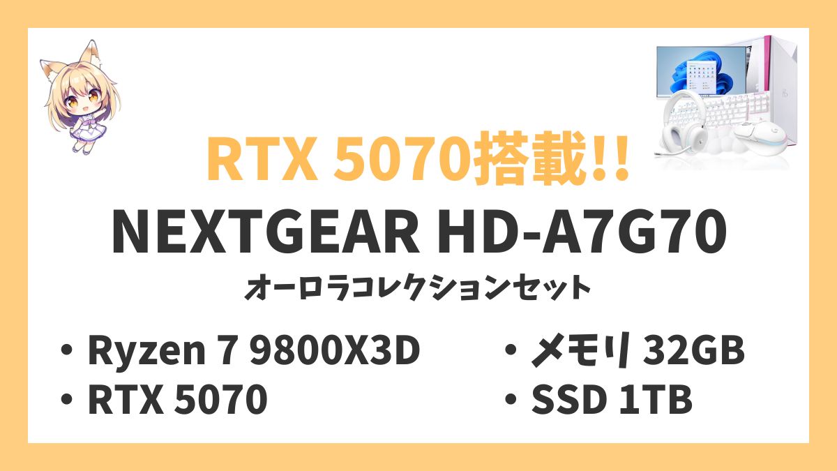 NEXTGEAR HD-A7G70(オーロラコレクションセット)は、RTX 5070を搭載したホワイトカラーのゲーミングPCセット。