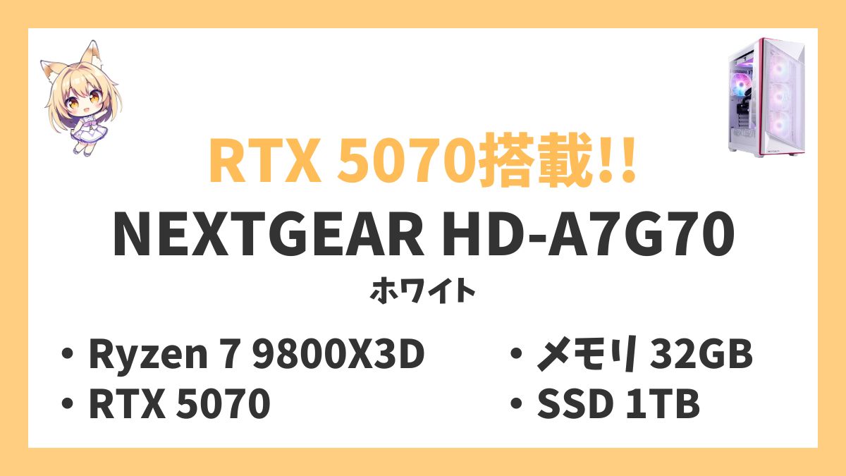 NEXTGEAR HD-A7G70(ホワイト)は「Ryzen 7-9800X3D」×「RTX 5070」のハイスペック構成ゲーミングPC。