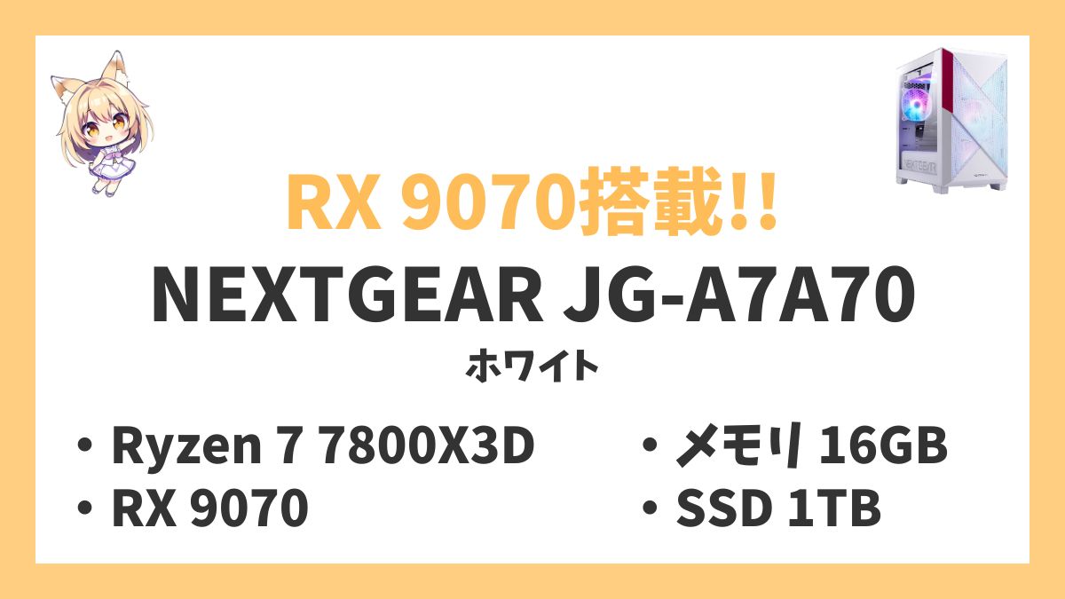 NEXTGEAR JG-A7A70(ホワイト)に搭載されるGPUは、「RX 9070」です。