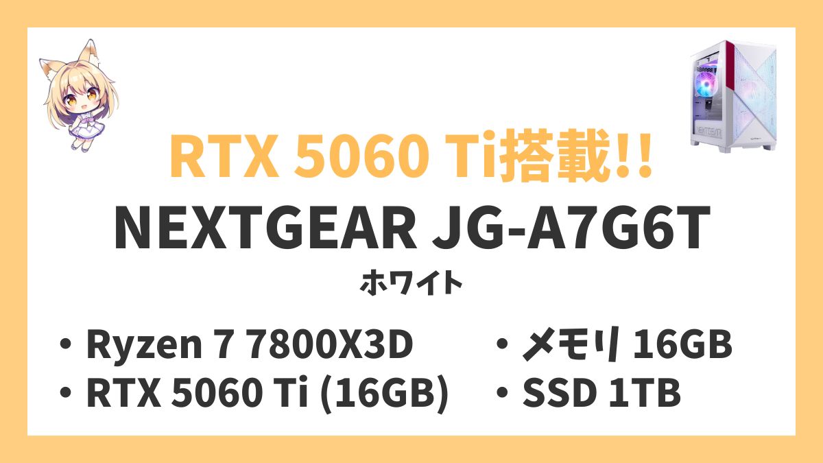 NEXTGEAR JG-A7G6T(ホワイト)は、「Ryzen 7-7800X3D」×「RTX 5060 Ti」の構成では最安クラスのゲーミングPCとなっています。