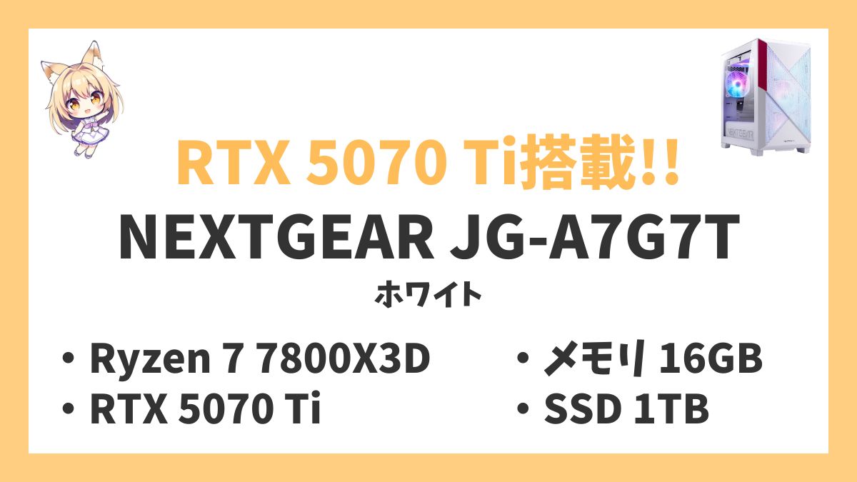 NEXTGEAR JG-A7G7T(ホワイト)は、「Ryzen 7-7800X3D」×「RTX 5070 Ti」の構成では最安クラスのゲーミングPCとなっています。